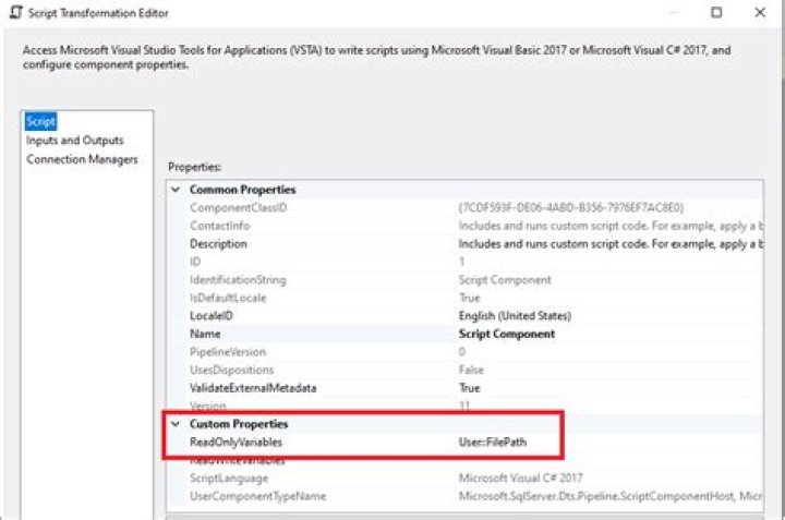 The Script Component provides another area where programming logic can be applied in an SSIS package. This component, which can be used only in the Data Flow portion of an SSIS package, allows programmatic tasks to occur in the data stream. This component exists to provide, consume, or transform data using . NET code.Click to see full answer. In respect to this, what are the components of SSIS? Important components in SSIS include : The package, there unit of work that is retrieved,executed and saved, and the most important Integration Services object. The control flow elements- Tasks and containers for building the control flow in package including precedent constraints. One may also ask, how do I use script component as a source in SSIS? STEP 1: Drag and drop the Data Flow Task from the toolbox to control flow region, and rename it as the SSIS Script Component as Source. Double click on it will open the data flow tab. Similarly, we added the remaining columns. Remember, you can use the Name property to change the Column names as need. Besides, what is the difference between Script task and Script component in SSIS? The Script component is configured on the Data Flow page of the designer and represents a source, transformation, or destination in the Data Flow task. A Script task can accomplish almost any general-purpose task. A Script task runs custom code at some point in the package workflow.Why is SSIS used?The primary use for SSIS is data warehousing as the product features a fast and flexible tool for data extraction, transformation, and loading (ETL).). The tool may also be used to automate maintenance of SQL Server databases, update multidimensional cube data, and perform other functions.