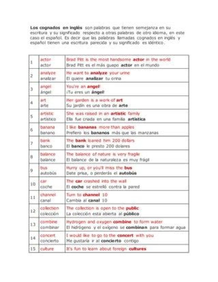 Cognado. Los cognados verdaderos son aquellas palabras que son escritas de la misma forma o similar o suenan igual o se asemeja en dos idiomas diferentes y que significan lo mismo, un ejemplo de ellos es que en español se escribe «chocolate» y en el inglés «chocolate».Click to see full answer. Besides, ¿Cuáles son los cognados simples? Los cognados falsos son las palabras en inglés que por su escritura se asemejan a alguna palabra en español pero en realidad tienen un significado diferente. Ejemplos cognados verdaderos: actor, actor. angel, ángel. art, arte. artistic, artístico. banana, banano. bank, banco. balance, balance. bus, autobús. Also, ¿Cuáles son los cognados y falsos cognados? Los falsos cognados o falsos amigos reconocen un origen común el latín pero evolucionaron con significado determinado en inglés y con otro parcial o totalmente diferente en castellano. Estas palabras son muy parecidas en nuestro idioma pero tienen un sentido distinto y en ocasiones con sentido opuesto. Keeping this in view, ¿Qué son cognados y ejemplos? Los cognados son palabras que comparten significado, ortografía y pronunciación similares en dos idiomas. 30% a 40% de todas las palabras en inglés tienen una palabra relacionada en español. Para los hablantes de español ELL, los cognados son un puente evidente al idioma inglés.¿Qué son los falsos cognados ejemplos? 20 ejemplos de falsos amigos (false friends) con los que te puedes confundir al aprender el idioma inglés: Advertise no es advertir. Assist no es asistir (a un evento) Bizarre no es bizarro. Conductor no es conductor (chofer) Contest no es contestar. Deception no es decepción. Delight no es delito.